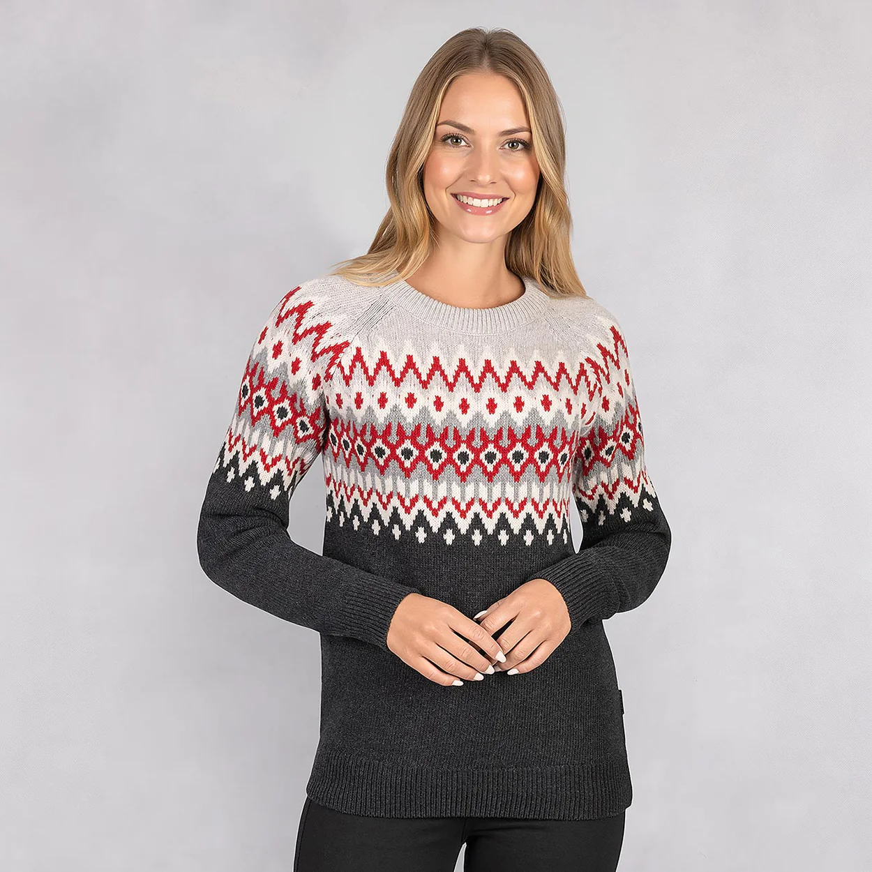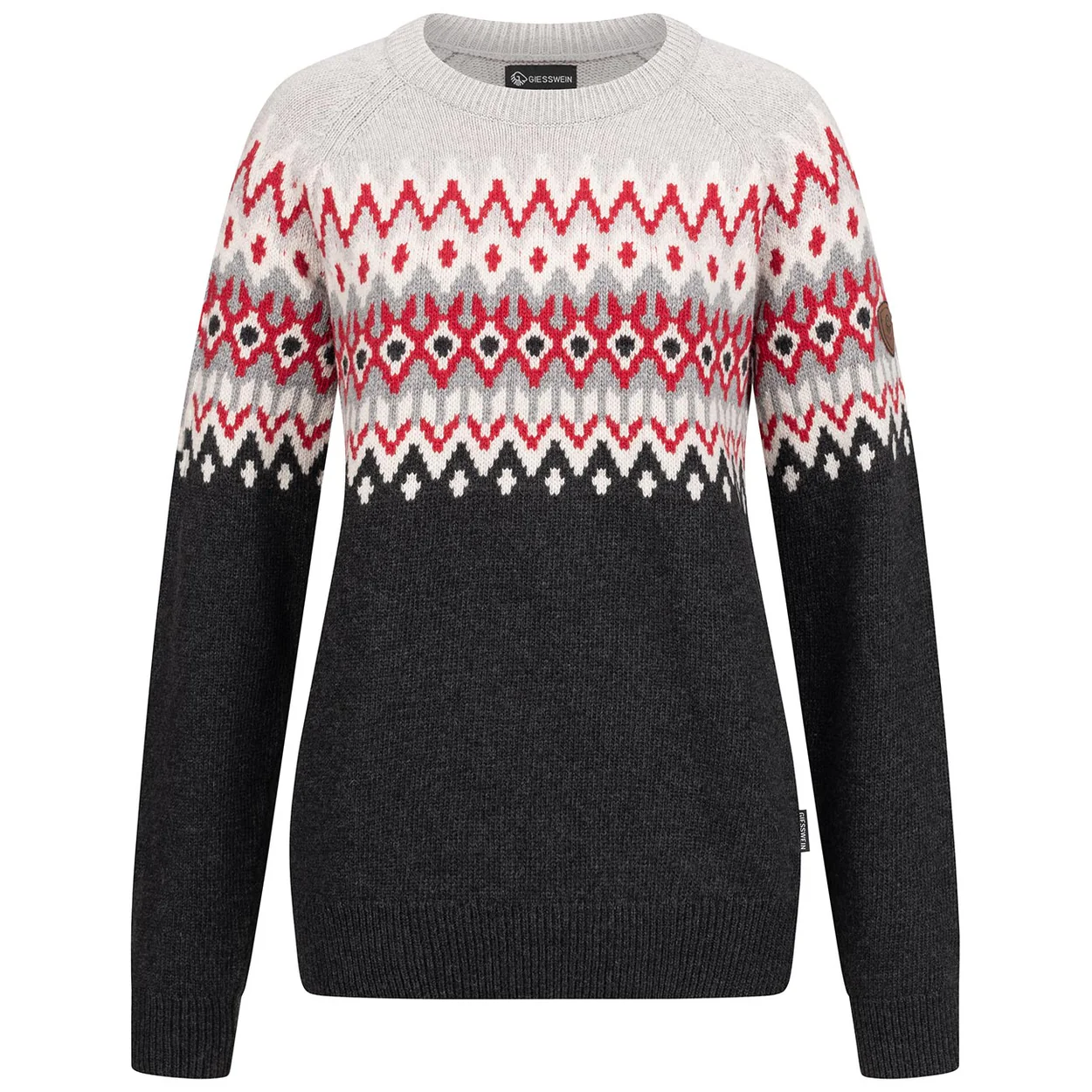 Fein, festlich und schön in Form gestrickt ist der elegante Merino-Lambswool-Pullover mit Jacquard-Muster aus dem Hause GIESSWEIN. Die zarten Woll-Fasern schmiegen sich kuschelig und weich an die Silhouette an und erzeugen wohlige Wärme. Die Raglan-Ärmel umschließen mit idealer Schnittführung die Schultern bis zum Hals, die tonalen Nähte perfektionieren die Figur-umschmeichelnde Optik. Der Rippstrick an Rund-Hals, Hüfte und Ärmeln schließt den Norweger-Pullover optimal ab und garantiert perfekte Temperierung mit atmungsaktiver Merinowolle. Das edle GIESSWEIN Leder-Patch am linken Ärmel unterstreicht die Hochwertigkeit des Nordic Sweaters aus unserer Strickmanufaktur. Der edle Lammwoll-Pullover mit nordischem Look lässt sich elegant zu Rock und Hose, sportlich zur Jeans oder chic zum Après-Ski kombinieren.